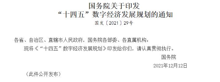 各省、自治区、直辖市人民政府,国务院各部委、各直属机构:现将《“十四五”数字经济发展规划》印发给你们,请认真贯彻执行。国务院2021年12月12日(此件公开发布)“十四五”数字经...